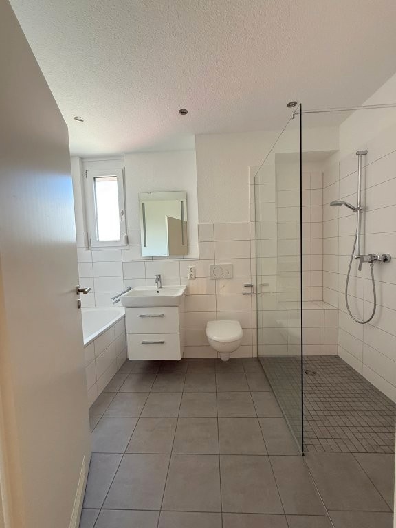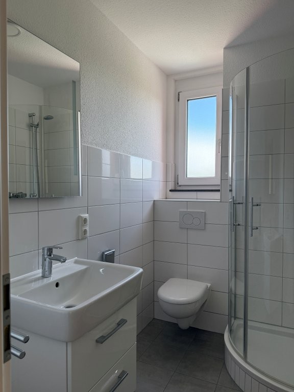 + in den Bädern 1. und 2. OG + Gäste-WC: anthrazitfarbener Fliesenboden, weiß glänzende, großformatige Wandfliesen (halbe Raumhöhe), alle Waschtische (3) mit Spiegel, Beleuchtung und Unterschrank, Glasduschabtrennungen/Kabinen