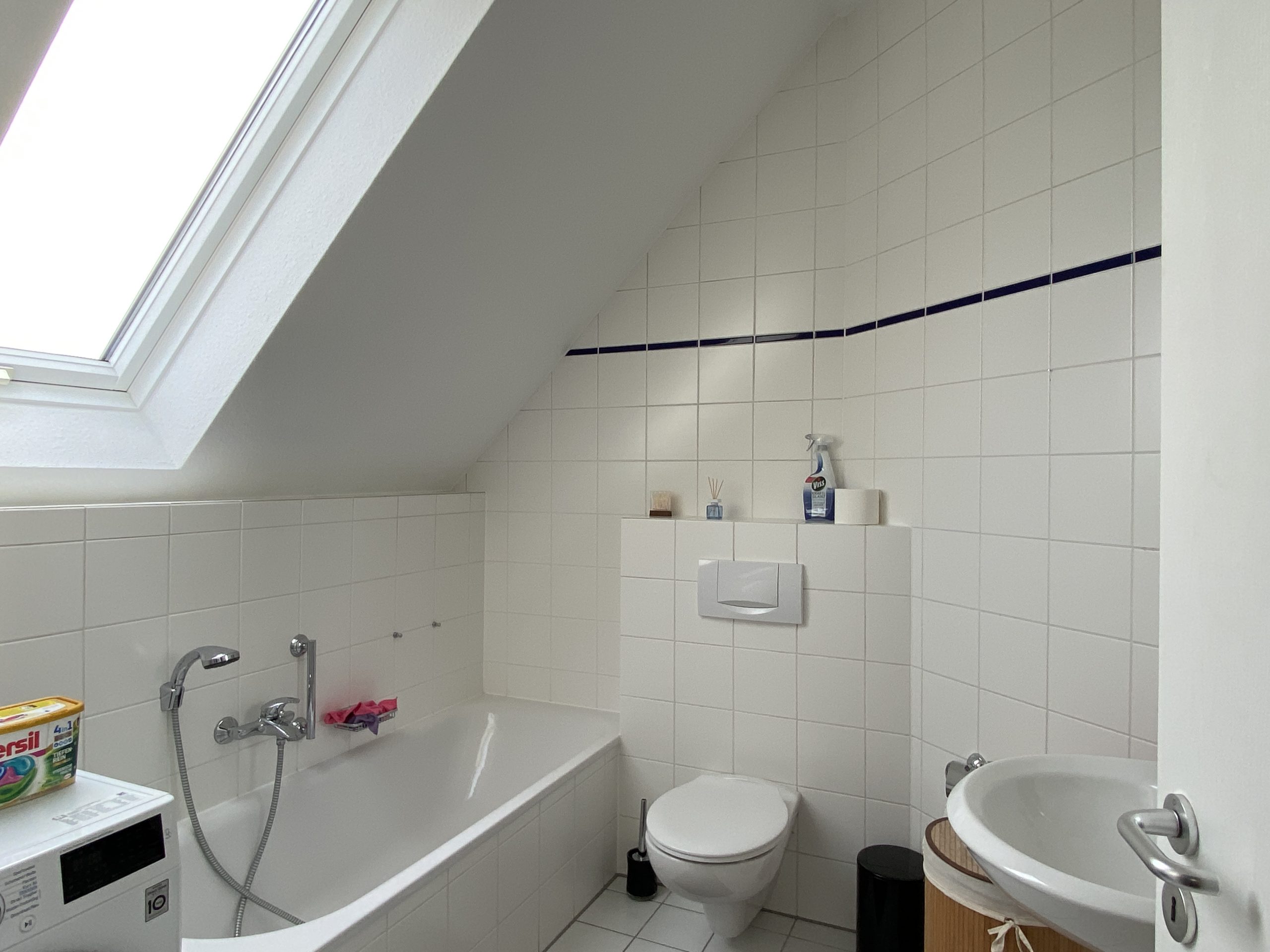 + weißes Badezimmer mit Badewanne und Waschmaschinen-Stellplatz oben