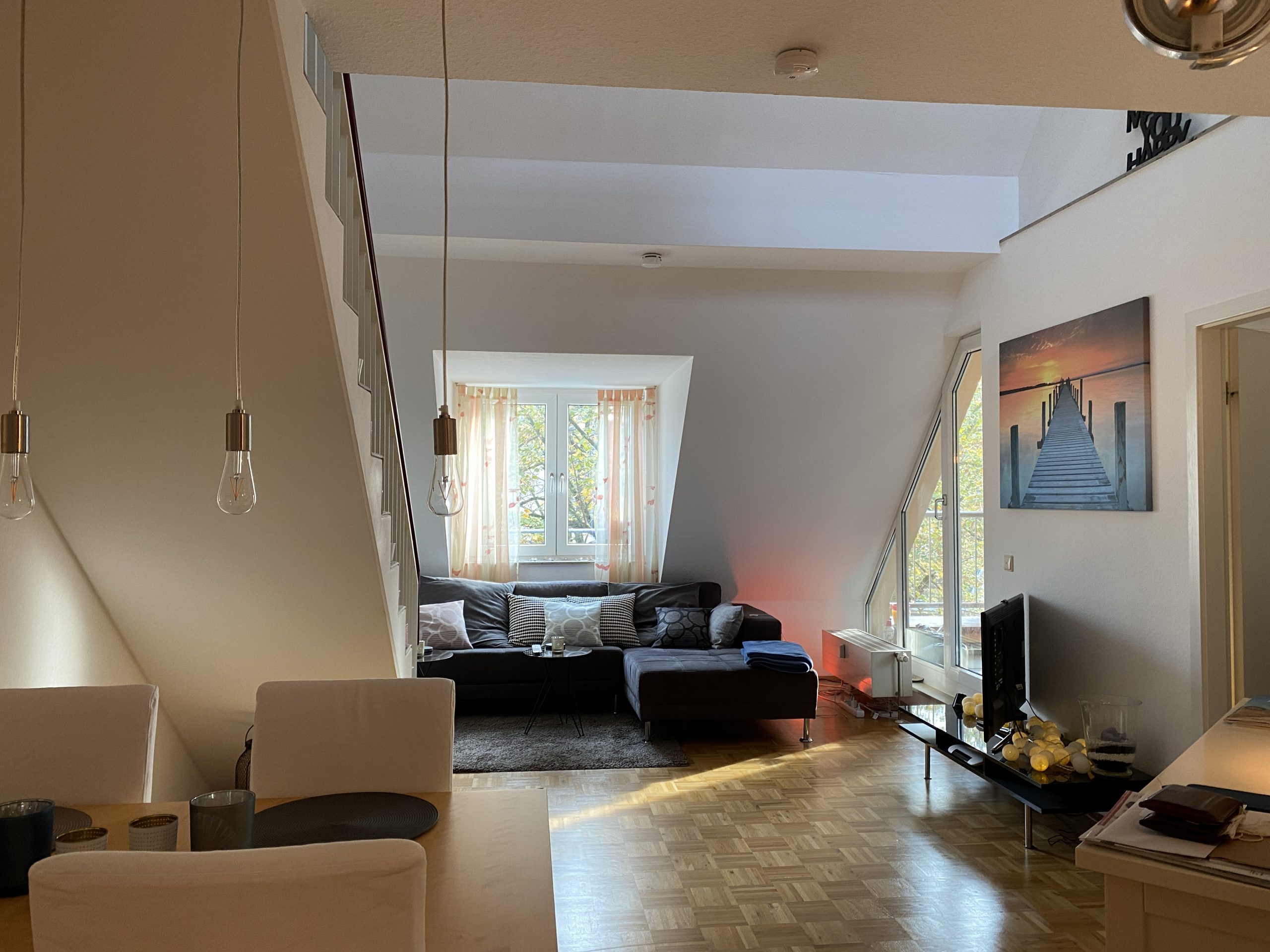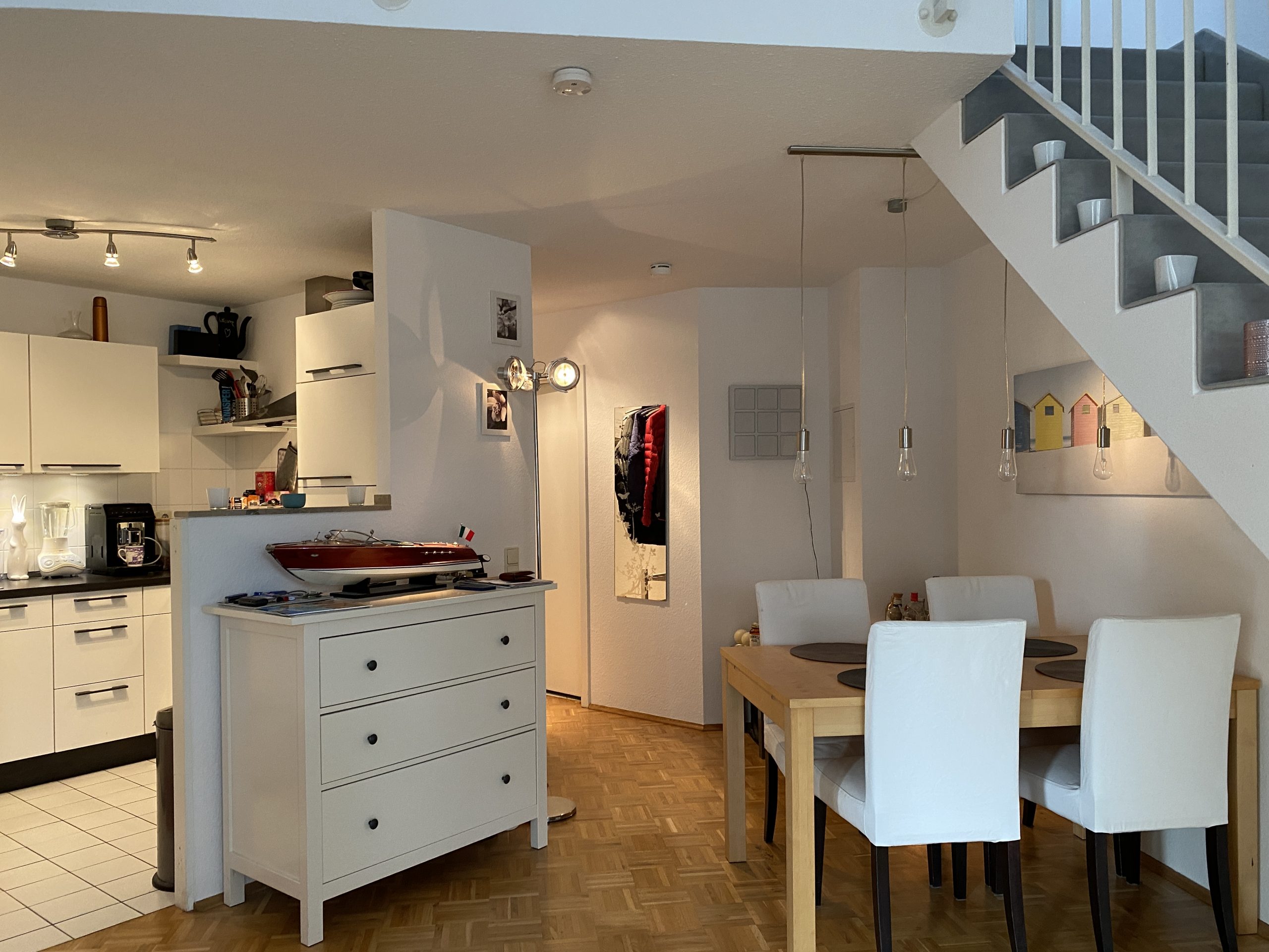 Die individuell geschnittene Wohnung besticht durch ihren charmanten Schnitt. Vom kleinen Eingangsbereich geht es geradeaus in das großzügige Wohnzimmer, direkt rechts befindet sich hier die offene Küchenlösung. Aus dem Wohn-/Essbereich gelangen Sie in das unten gelegene Schlafzimmer/Büro und von dort abgehenden Balkon. Ebenfalls finden Sie unten ein innen liegendes Badewannenbad. Über die Treppe gelangen Sie in die zum Wohnraum offene Galerie, hier als Schlafzimmer genutzt, mit angrenzendem Badezimmer und einer kleinen Ankleide. Die Video-Gegensprechanlage ist ein Extra, welches nicht alltäglich ist. Zur Wohnung gehört ein oberer Duplex-Tiefgaragen-Stellplatz (plus 15.000 €, da separates Grundbuch!)